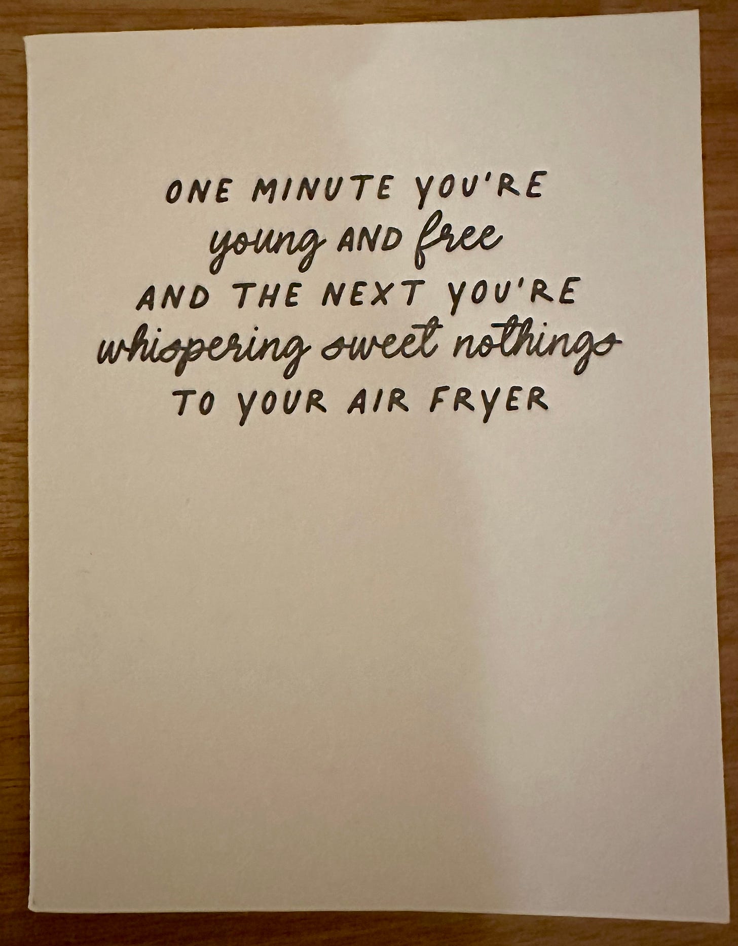 This Air Fryer. Long-time readers will remember my progression from air fryer skeptic to happy customer. I am pleased to report that it has now become my entire personality. My siblings have an “air fryer countdown,” placing bets on how long it will take me to bring it up in casual conversation when they see me. And my sisters got me this card for my birthday: