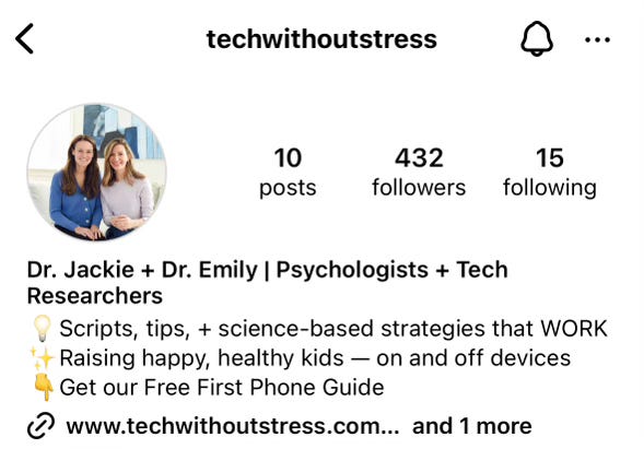 My new @techwithoutstress Instagram account. Dr. Emily Weinstein and I are now sharing tech parenting tips on Instagram! Follow along as I learn to "talk to camera” without dying of embarrassment. Seriously though, I’m very excited to share balanced, evidence-based info in a new (for me) format. Join us!!