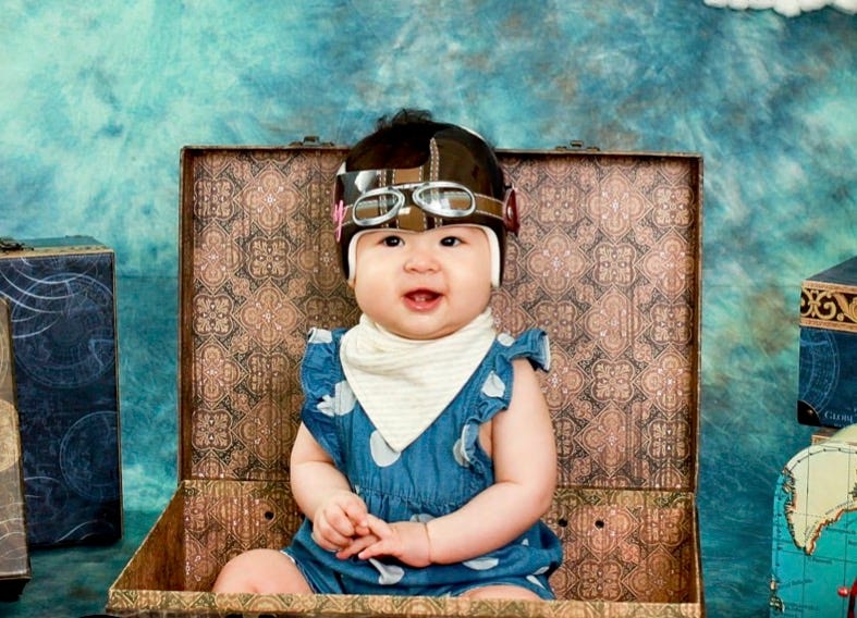 I look closer at the recently posted photos. Are those tiny gold coins artfully scattered in the backdrop of a St. Patrick’s Day-themed helmet baby photo shoot? Is that baby, surrounded by silver-embossed suitcases and an antique globe, wearing a cranial band custom decorated to look like a vintage flight helmet with aviation goggles? Where on earth does one find baby-sized regalia for a helmet graduation photo?4