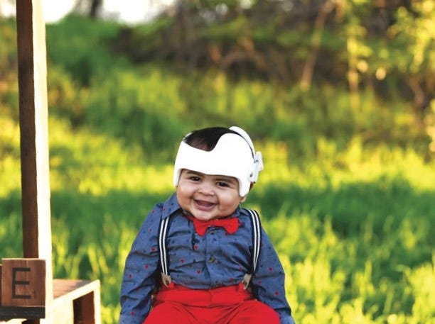 It could also be the seemingly desperate attempts to integrate this ugly, white plastic baby helmet into existing portraits of perfect family life. We’re normal! The photos scream through filters and smiling faces. Look at our letter boards! “Fixin’ my noggin” or “under construction,” they read. Nothing to see here! Just a picture-perfect family with a cute new accessory.