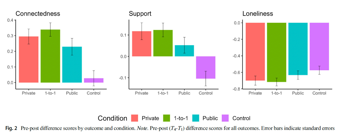 How about differences between the gratitude groups? Was texting one-on-one better than posting on social media or writing privately? For two outcomes, yes. The one-to-one texting group showed greater increases in feelings of social connectedness (i.e., a sense of intimacy or relatedness with the people you spend time with) and social support (i.e., a sense that you can depend on the people around you for help, encouragement, and support).