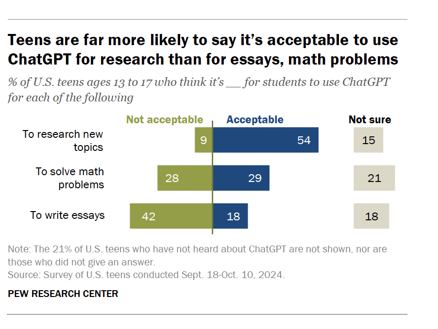 Teens’ views on when it’s acceptable to use ChatGPT vary by academic subject. 54% say it’s acceptable to research new topics, but only 18% to write essays.