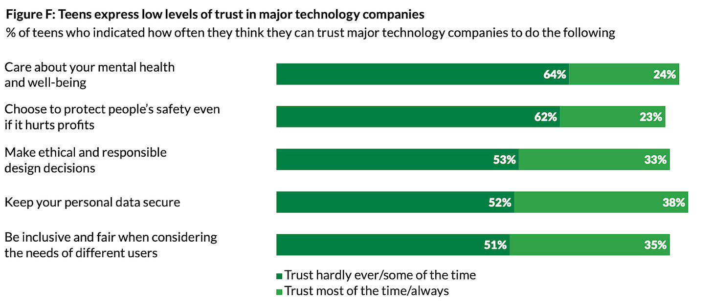 Overall, teens’ trust in tech companies is somewhat low, especially when it comes to trust that companies care about their mental health and well-being, and that companies will choose to protect people’s safety at the expense of profits.