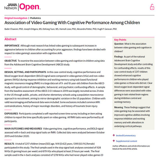 Even more interesting, recent evidence, like this large-scale fMRI study published last week—and, perhaps more consequentially, tweeted by famous psychologist Adam Grant—suggests that playing video games may have cognitive benefits for kids, including improved working memory and response inhibition.