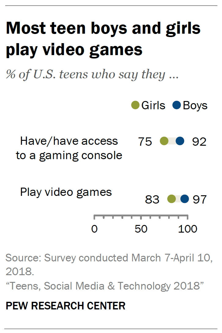 Teens: Video games are nearly universal. 97% of teen boys, and 83% of teen girls report playing video games of some kind (computer, console, or mobile)