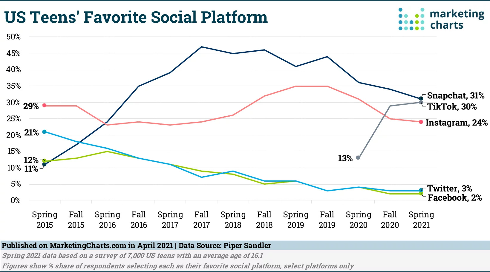 Teens’ favorite social platforms are: Snapchat (31%), Tiktok (30%), and Instagram (24%). Those three sites cover the favorites for 85% of teens. These are also the sites where teens are spending most of their social media time.