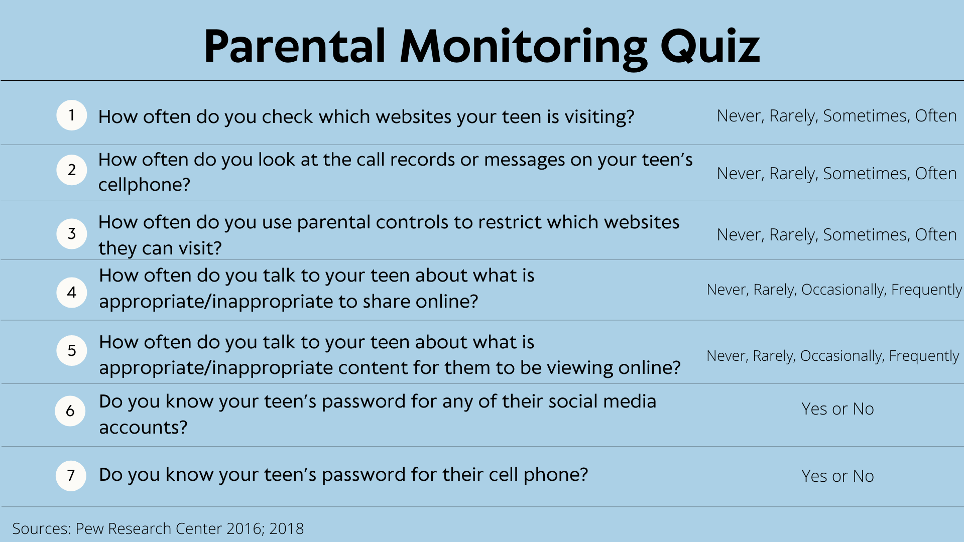 This quiz—like most of parenting—has no right answers. Instead, all we have is some data. These questions come from surveys conducted by the Pew Research Center in 2016 and 2018, with thousands of parents of 13- to 17-year-olds across the country.