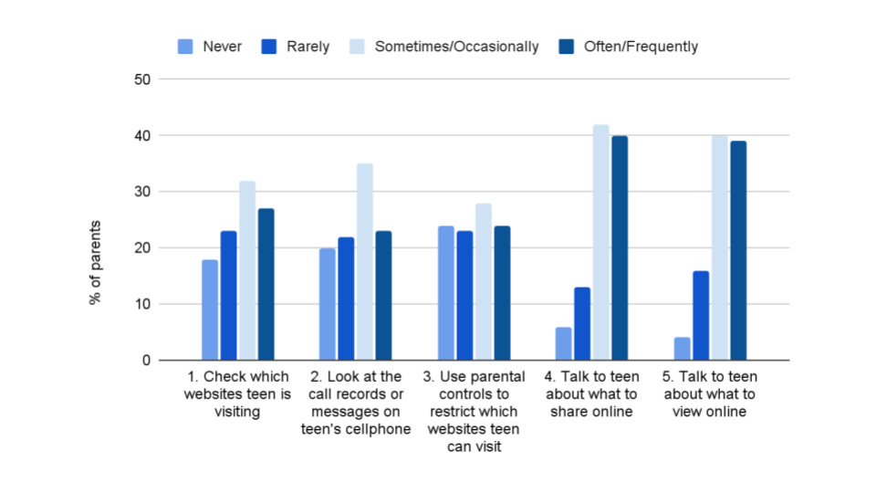 What to make of these numbers? With the exception of talking to their teens about their online behavior—which most parents seem to do—there is actually very little consistency in the choices parents make about supervising their teens’ phone use. Parents are somewhat evenly split on various monitoring behaviors. This means that whatever you’re doing, whether you choose to share passwords or not, or whether you choose to check your teen’s browsing history or not, you’re not alone.