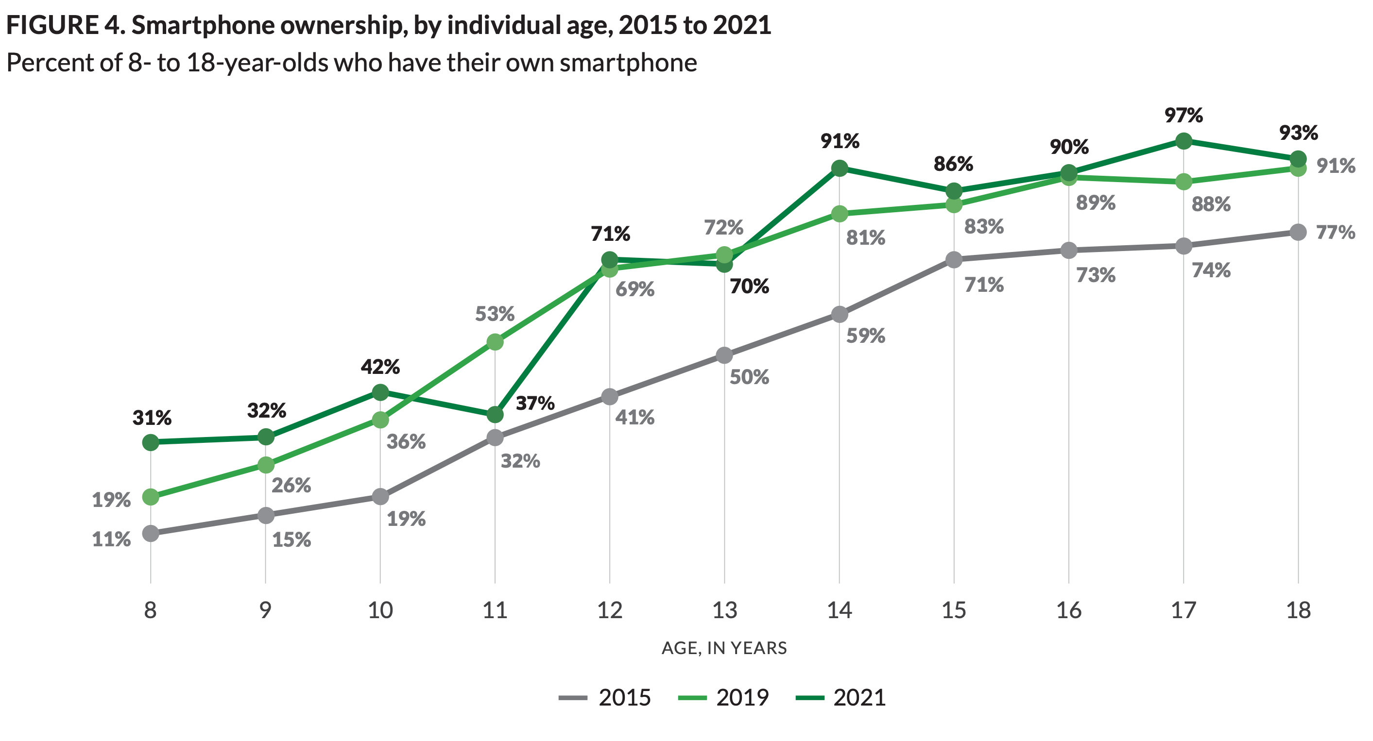 As of 2021, 42% of kids own a smartphone by age 10, and 91% have one by age 14.