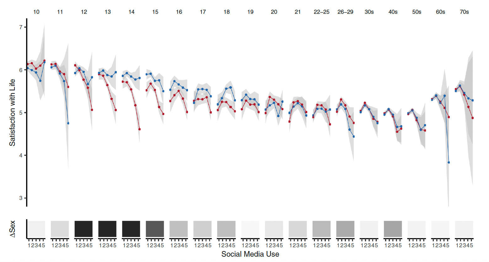 So, what we see here is that in younger adolescents, those ages 11 to 15 or so, the relationship is pretty linear. At those ages, kids who use more social media use also report lower life satisfaction. And based on the shading at the bottom of the figure, we know that it’s generally worse for girls.