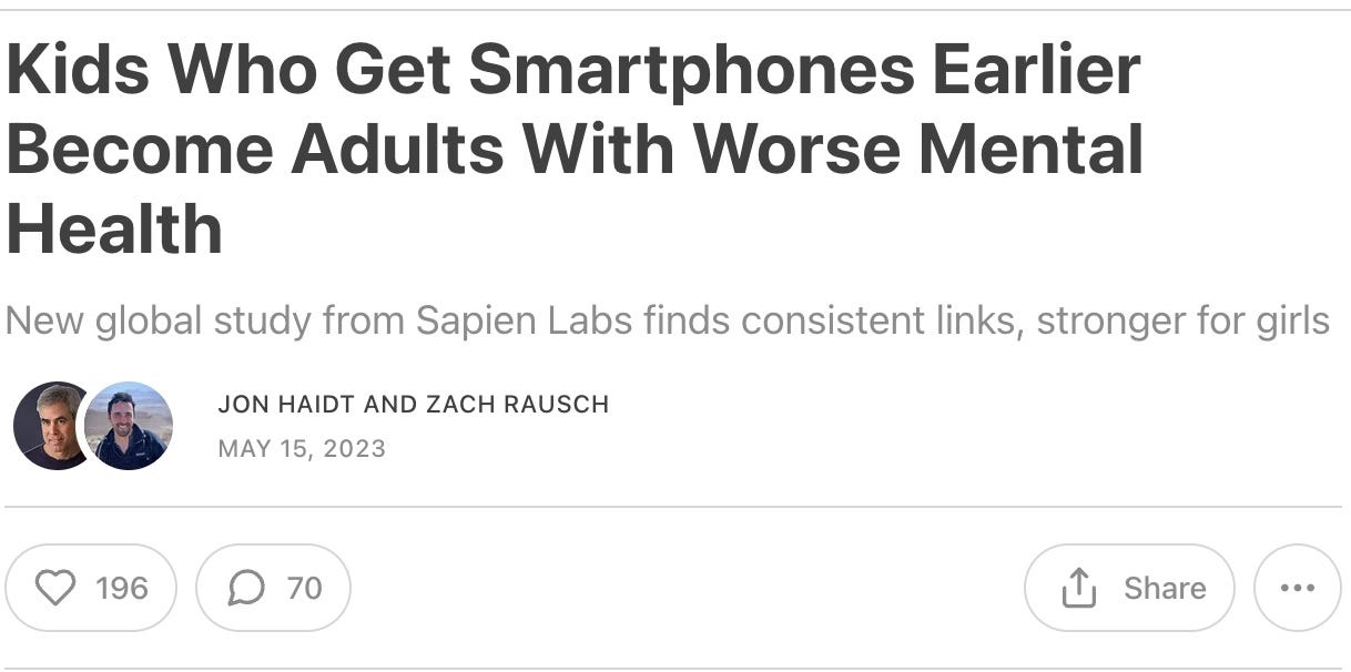 The interesting thing about the wording of this question—which lumps together access to smartphones and tablets (e.g., iPads)—is that, taking the findings at face value, we’d have to conclude that kids should not be getting tablets at early ages, either. In fact, if we really take the findings literally, one could argue that no child should get a smartphone or tablet until age 18, since these are technically the adults reporting the highest levels of mental health. I have not heard anyone arguing for this.