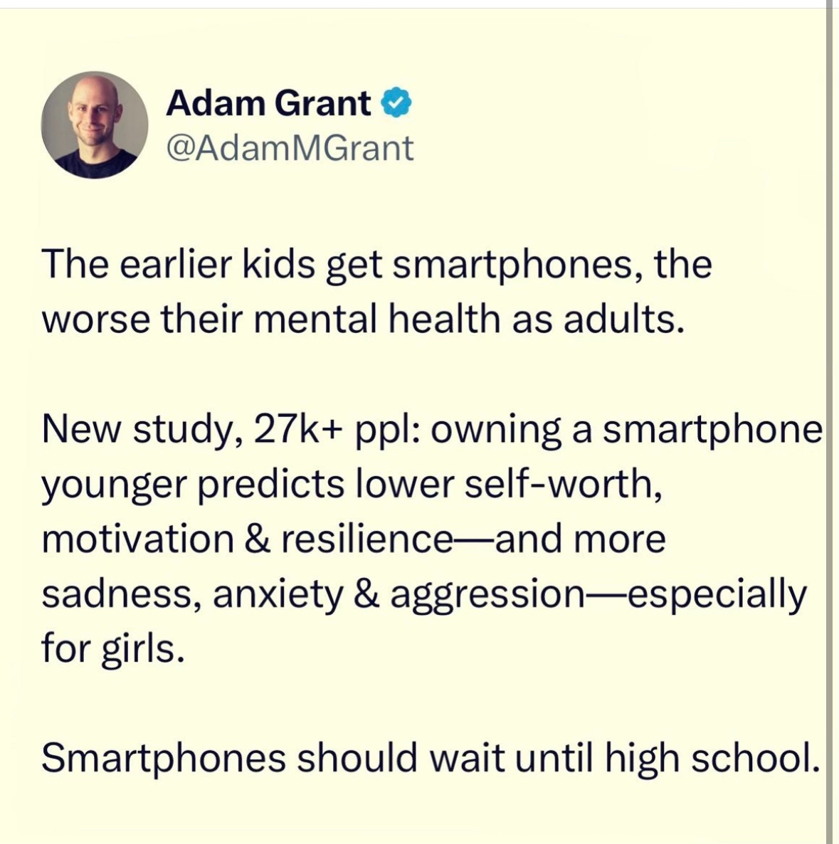 Might it be a good idea to wait on smartphones until high school? Absolutely. Should we consider holding off on social media until kids are 14 or 15, or maybe even 16? Sure! These things make a lot of sense to me.
