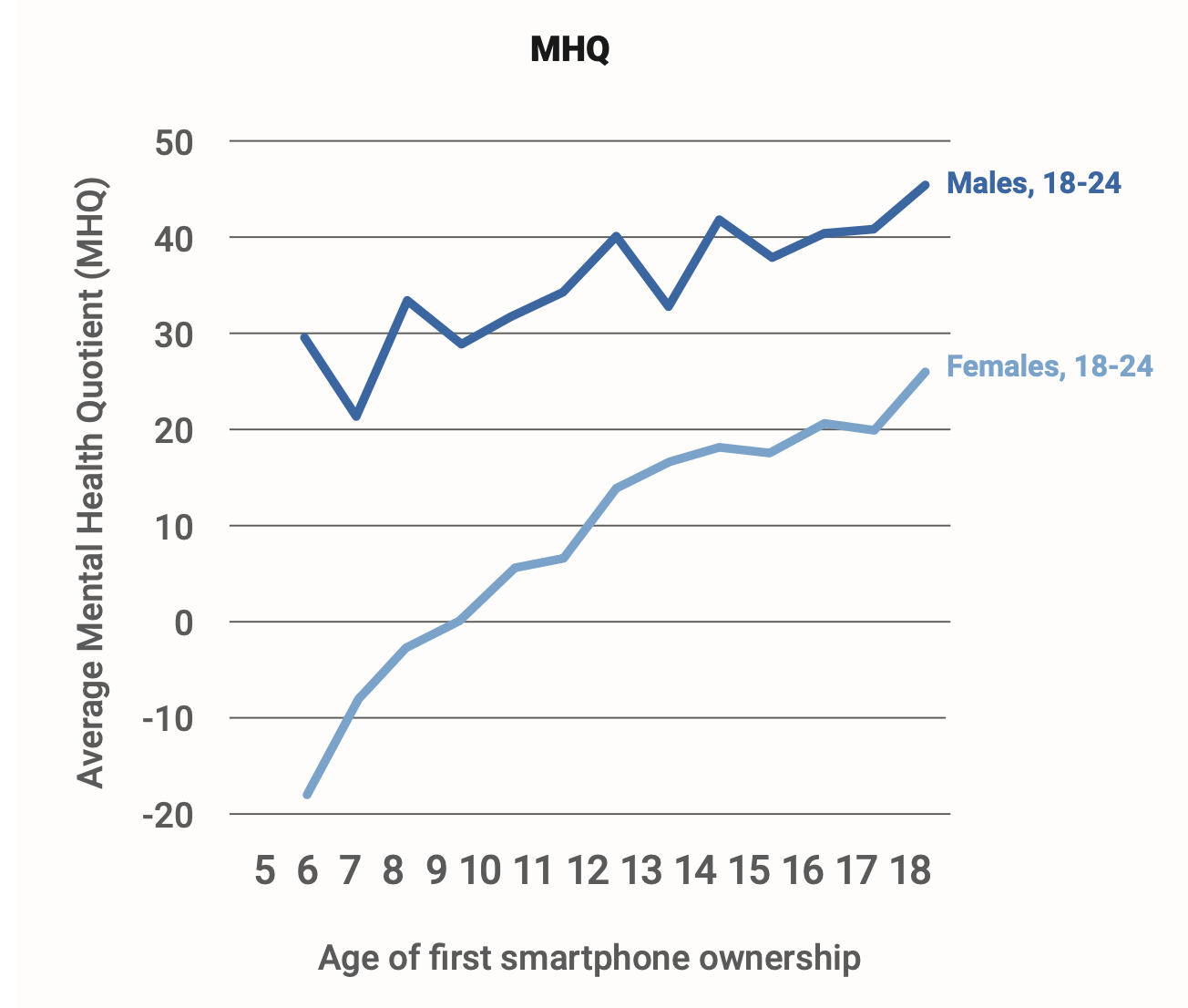 Researchers then analyzed the data to examine the average MHQ score of respondents who got a smartphone/tablet at each age. See, for example, this nice chart: