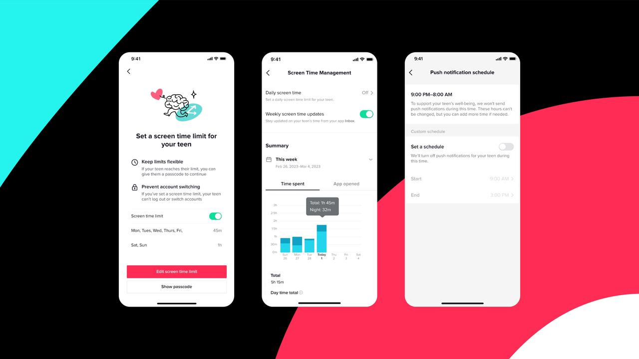 Time limit reminders. Teens get a notification telling them to leave the app after 60 minutes each day (note: they can choose to ignore this).