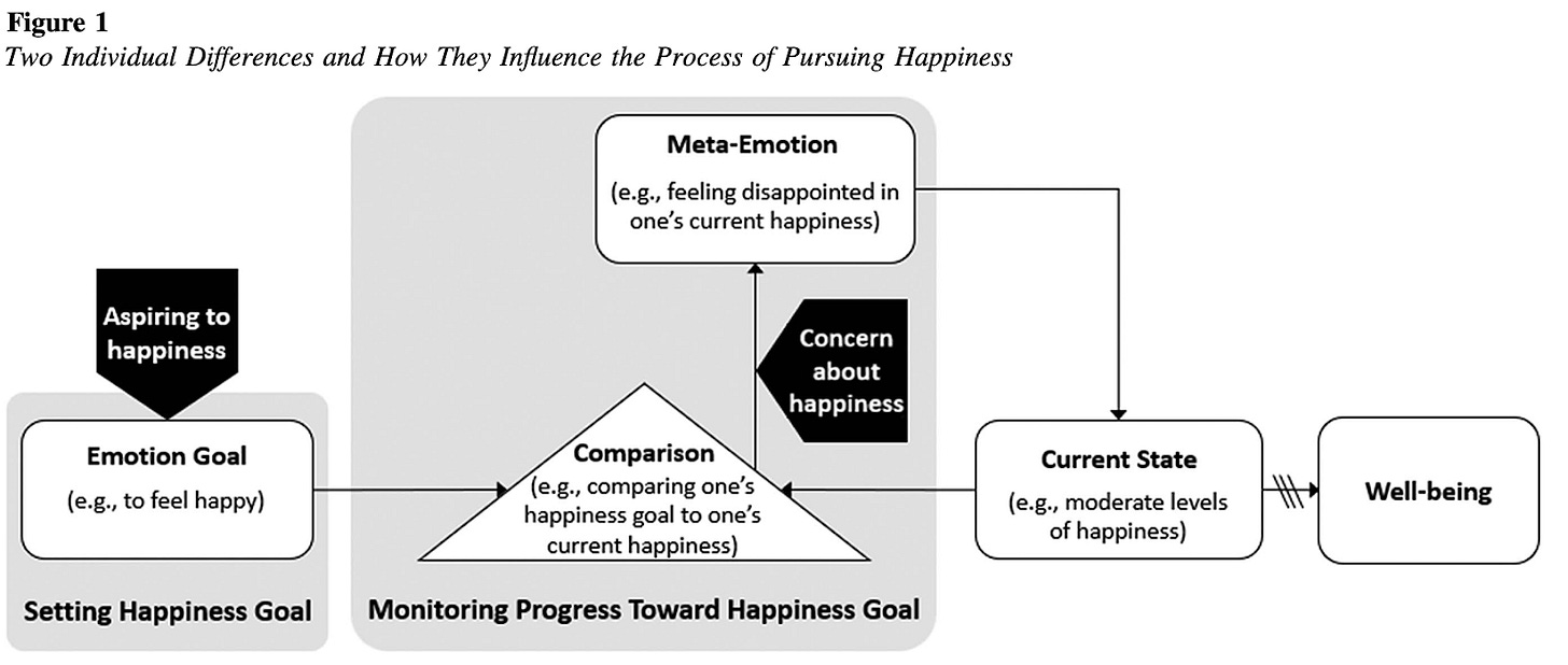 In a series of studies, the researchers separate the “pursuit of happiness” into two components: aspiring to happiness (“Feeling happy is extremely important to me”) and concern about happiness (“I am concerned about my happiness even when I feel happy.”) Across multiple samples (totalling over 700 adults) and time frames (concurrently, and longitudinally over 6 months), aspiring to happiness had no impact on actual well-being, but concern about happiness was a different story. Those who were more concerned about being happy reported lower life satisfaction, lower well-being, and higher depressive symptoms.